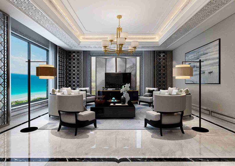 本案例戶型比較特殊,客廳三面是窗、且都能看到大海。整體設(shè)計(jì)因原本這個(gè)空間戶型有梁,空間感并不理想。為了改善這一情況,設(shè)計(jì)者通過木雕把梁化解掉,把空調(diào)藏進(jìn)去,這樣無形中起到了很好的裝飾作用,增強(qiáng)了空間的層次感與美感。