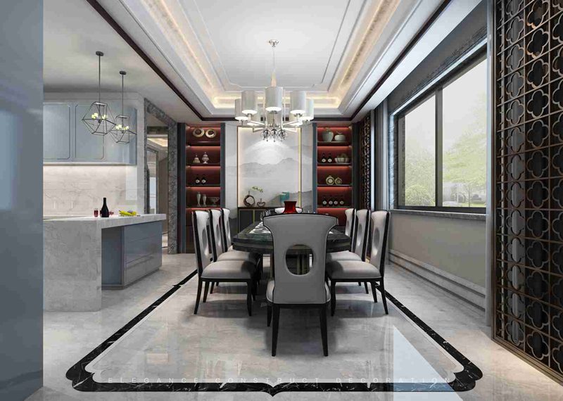 “如果奇跡有顏色,那一定是中國(guó)紅!”它以其豐富的文化內(nèi)涵,氤氳著古色古香的氣息,延續(xù)著盛世氣派。餐廳與書房設(shè)計(jì)手法相似,立柱采用藍(lán)色硬包,襯底采用中國(guó)紅,整體純度降低比例加大、藍(lán)色比例縮小。紅與藍(lán)顏色比例選用低調(diào)大氣,構(gòu)成一道繽紛的傳統(tǒng)色彩風(fēng)景線。