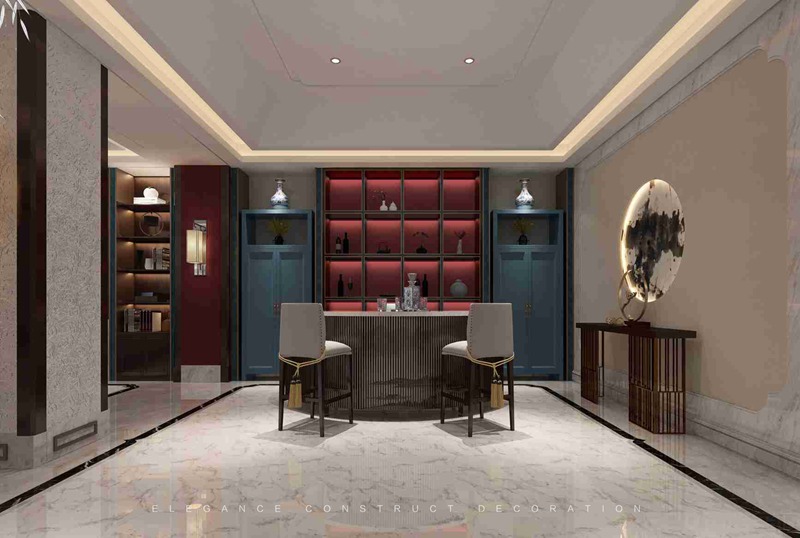 一層地下區(qū)域全部打通。從樓梯下至一層,直對(duì)水吧區(qū)域,呈現(xiàn)眼前的是一個(gè)集美酒、美景、文化的共享空間。它的設(shè)計(jì)脫胎于中國(guó)雅文化色彩對(duì)其空間運(yùn)用表達(dá),用景泰藍(lán)、中國(guó)紅等皇家柜體用色反應(yīng)設(shè)計(jì)之美。又以山水畫吧臺(tái)弧形線條柜、青花瓷瓶擺件、玉石小景、祥云雕刻創(chuàng)造經(jīng)典中式情境,是一個(gè)充滿雅致格調(diào)的水吧