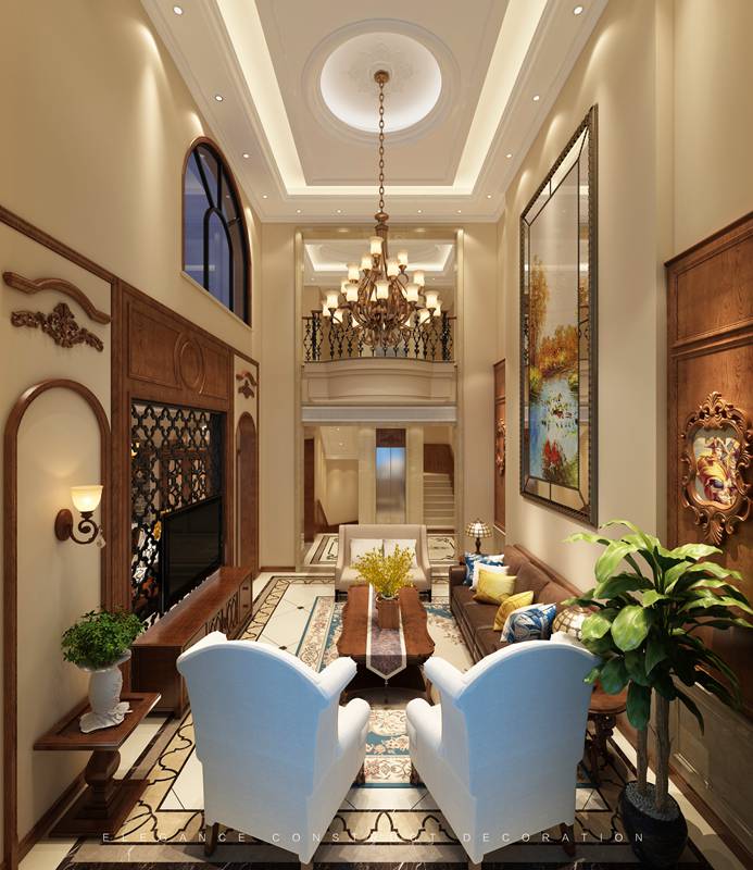 Living Room space lines and Radian time filled with a little gentleness, warm colors filled with a sense of elegance, Crystal Chandeliers, metal embellishment, add the light luxury of space, under the designer's collocation, complicated but not miscellaneous, fresh and full, the details are elegant. The empty living room becomes the eye of the space, light from the top down light sprinkle, enjoy the sunrise during the day, enjoy the moon at night, a happy scene.
