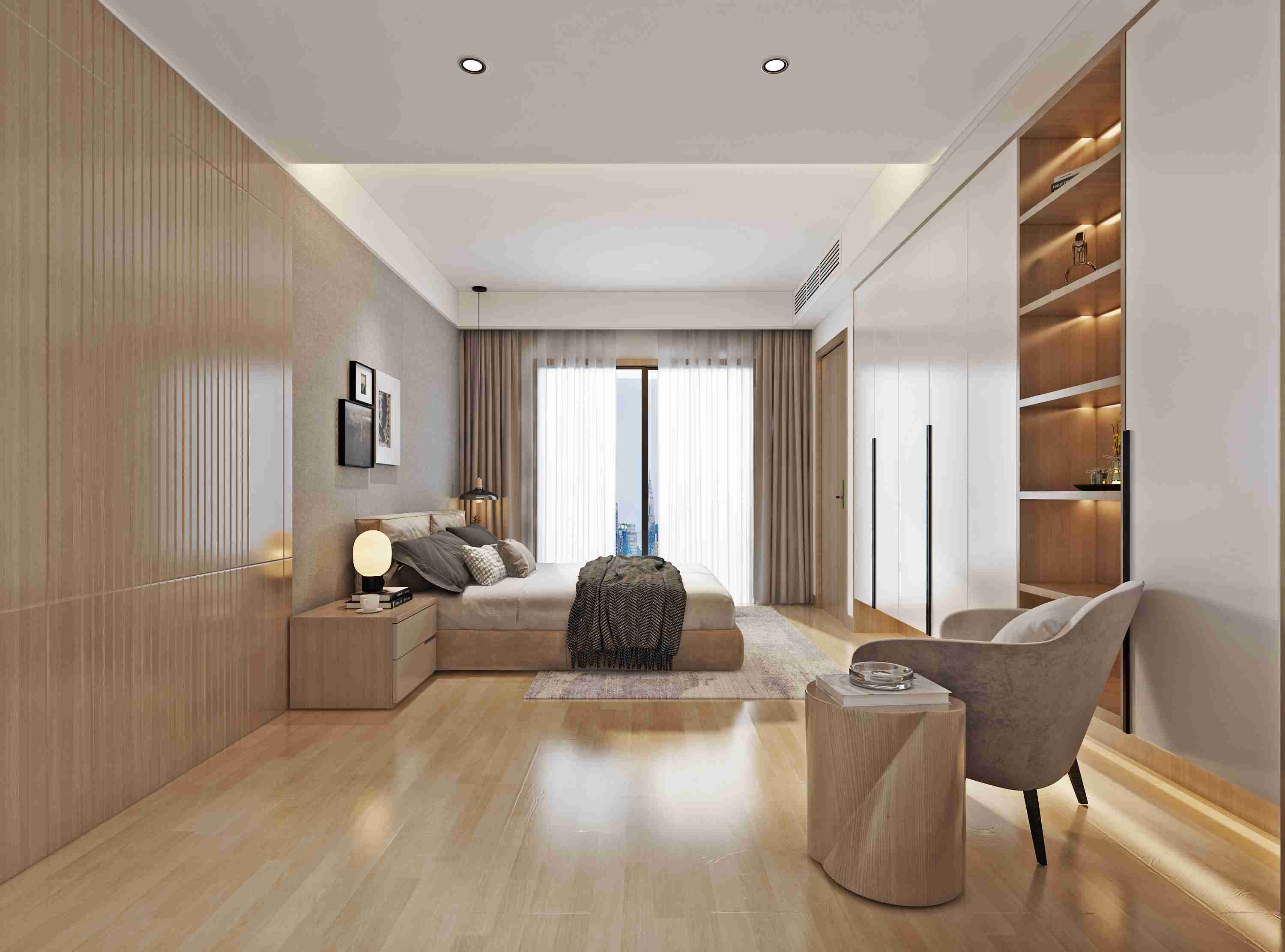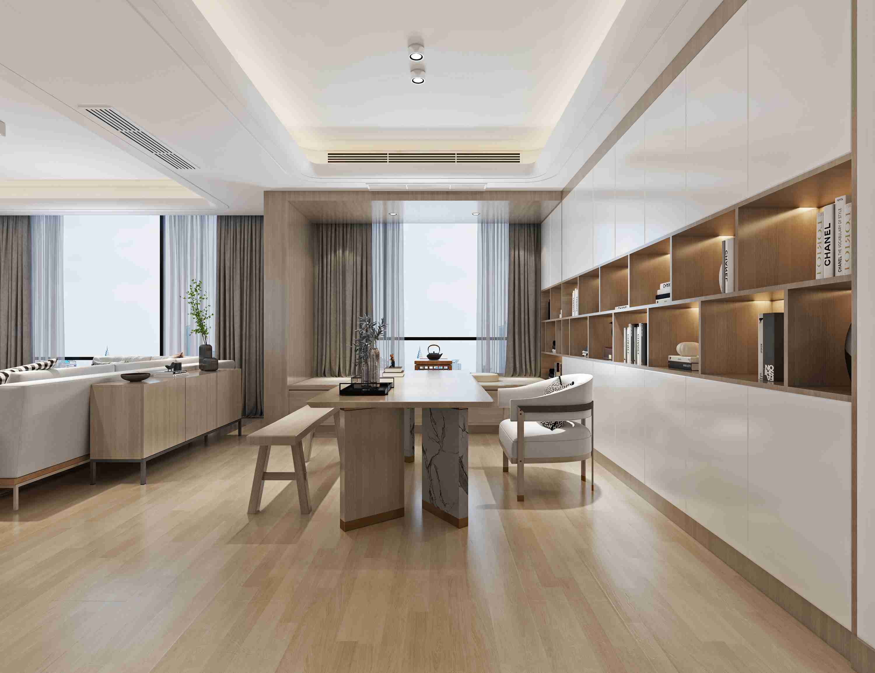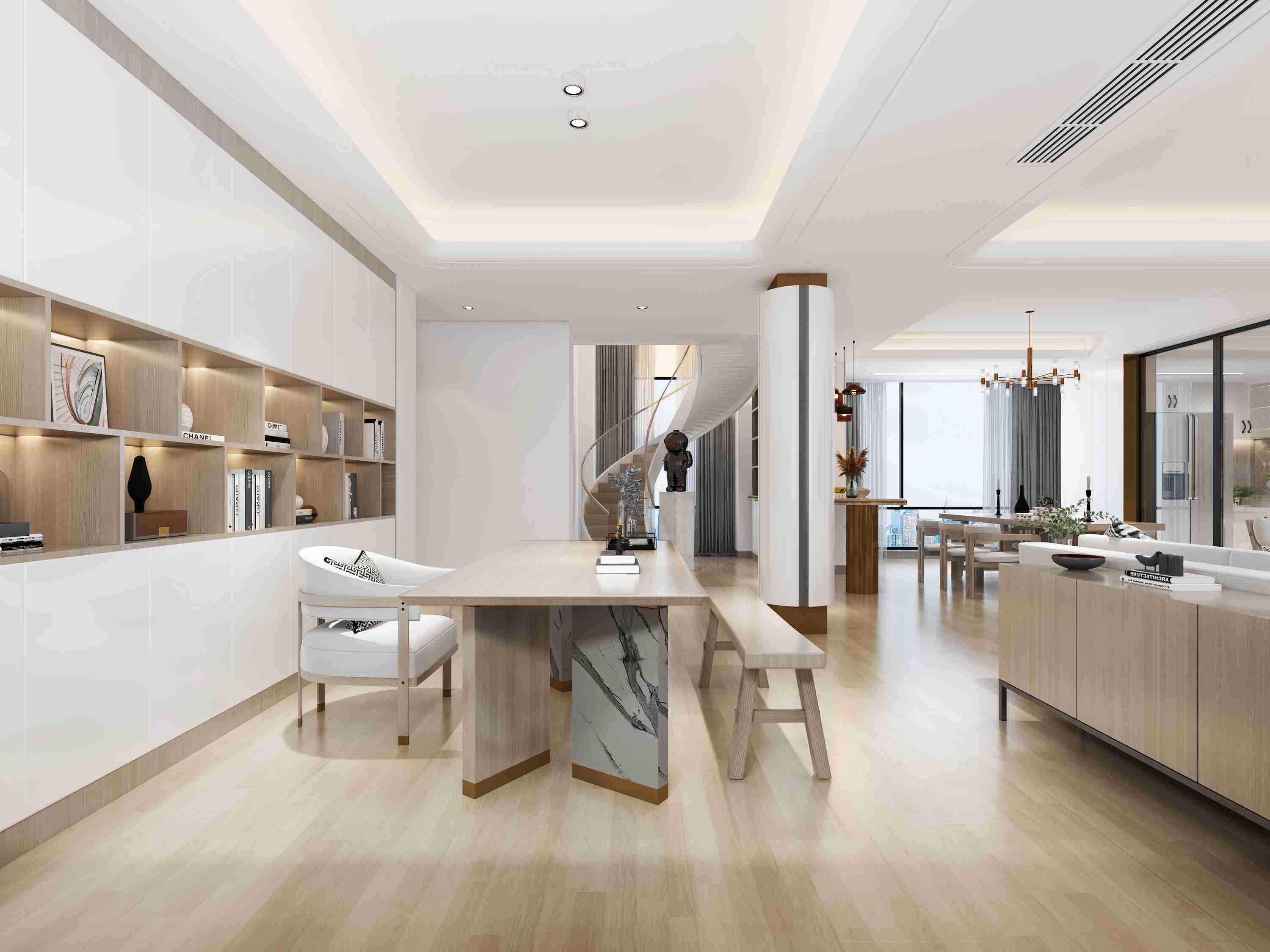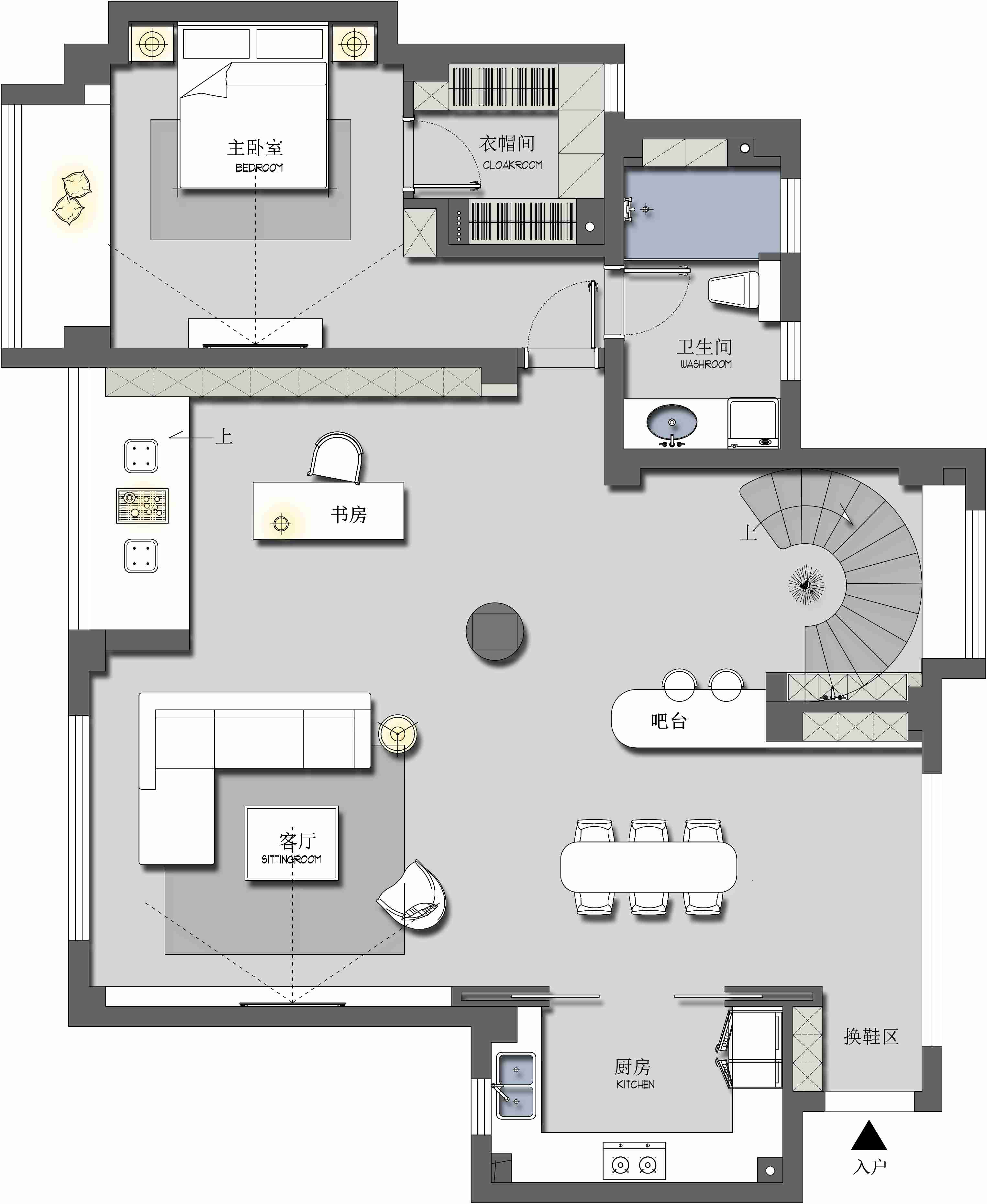 因?yàn)榭紤]到男業(yè)主回家的次數(shù)是不多,回來以后就是也會(huì)在家辦一些公事,所以需要一個(gè)男業(yè)主的書房,但是不?;丶?,所以就是把它跟客廳就是放在了一層這樣。