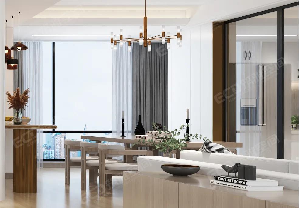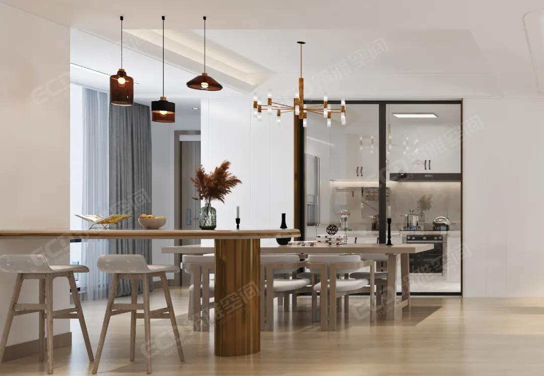 電視墻與餐廳的墻面別出心裁的設(shè)置收納柜,將簡約的形式展現(xiàn)的恰到好處精心珍藏的愛書、美酒點綴,生成一面妙不可言,營造出如舒適愜意的生活體驗。