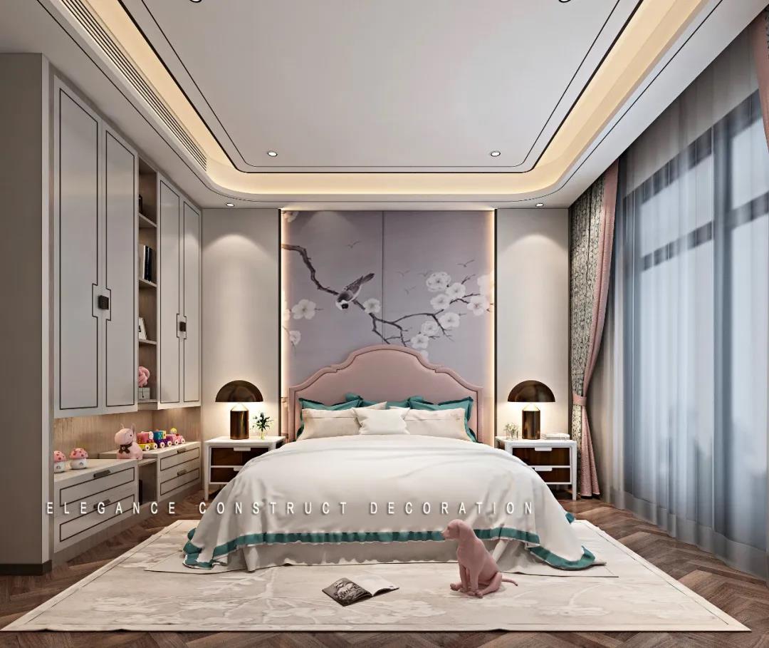 國(guó)風(fēng)的床頭背景,蘑菇形的床頭燈設(shè)計(jì),溫和而充滿童趣,溫馨的搭配無(wú)處不散發(fā)著親情的感動(dòng)。