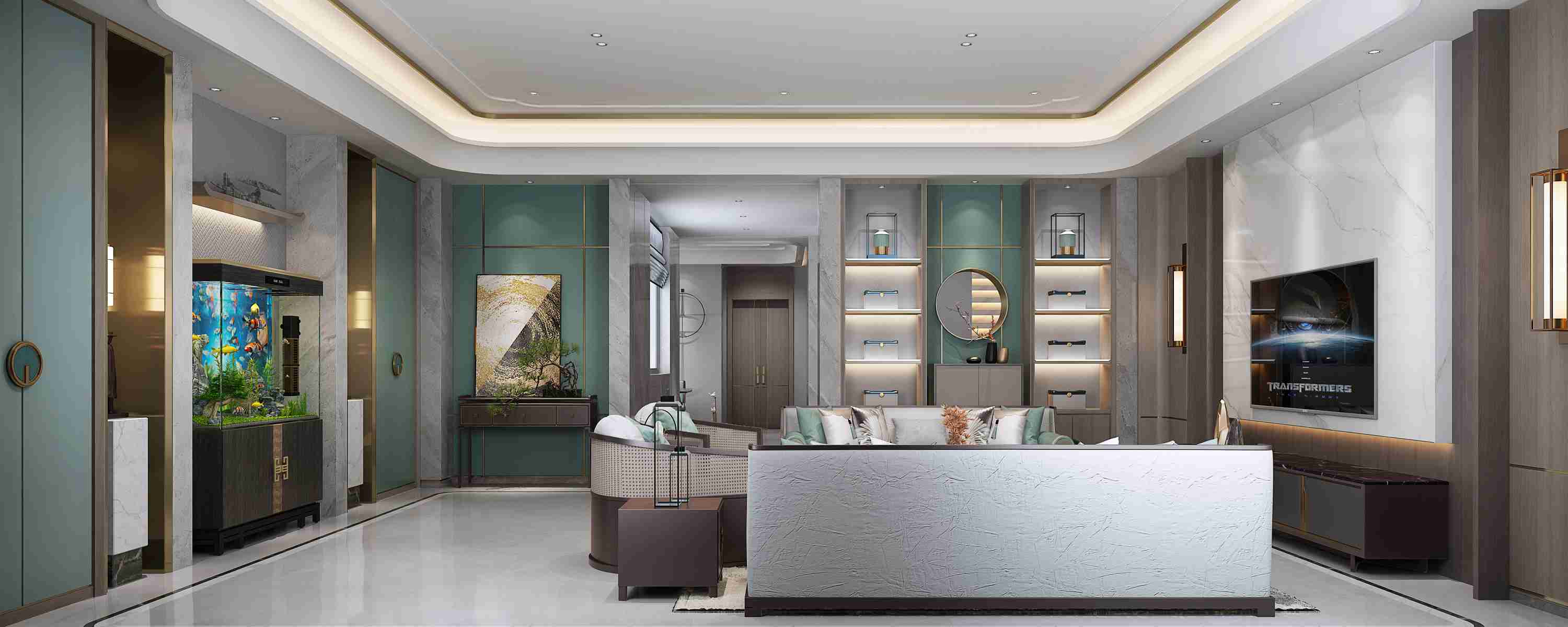 張老師通過灰色搭配藍(lán)色的搭配給予客廳輕盈的呼吸感,遠(yuǎn)處的魚缸賦予空間更多生機(jī),從空間布局、軟裝配飾到氛圍營造,都傳遞出生活的寧靜與美好。