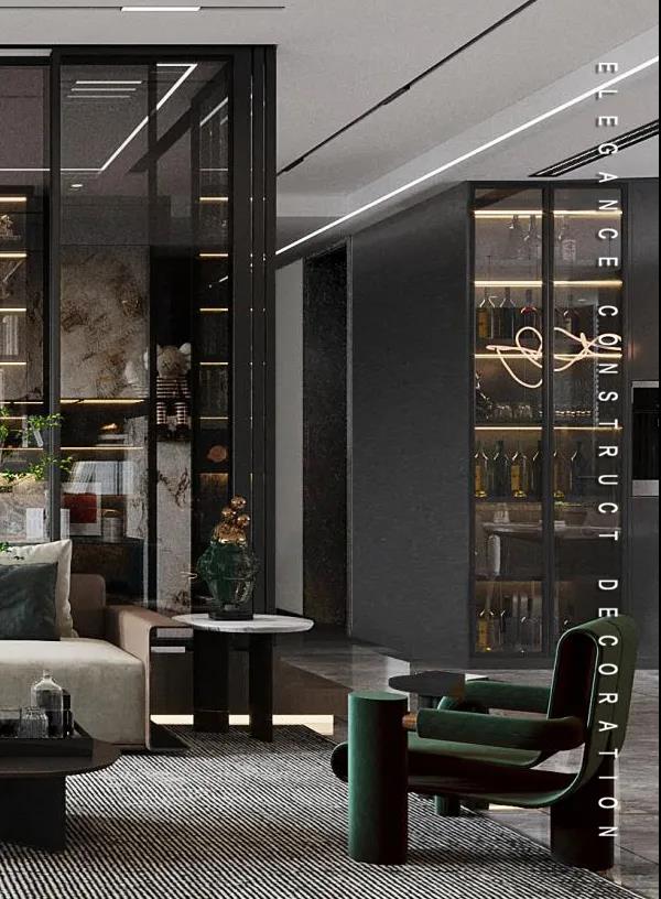 灰色和白色客廳的主角,墨綠色座椅的加入,融入一份生命和延續(xù)感。抬高的書房空間設(shè)計,提高了空間的層次,流暢的布局及舒適的尺度,為日常的交流互動提供恰到好處的生活場景。