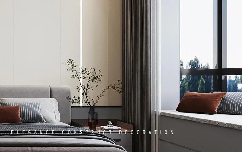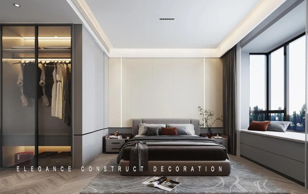 臥室的設(shè)計,遵循“少即是多”的裝飾原則。軟裝和燈光的配合相得益彰,營造一個舒緩靜謐的睡眠環(huán)境。主臥的收納柜采用磨砂材質(zhì),給予居住者更強的舒適感和安全感。