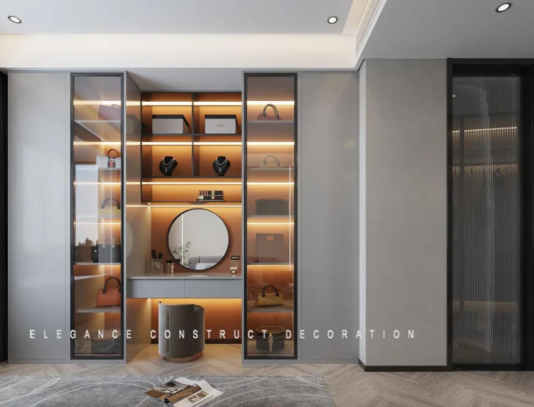 在靠墻的一側(cè),為女主人貼心設(shè)立了專屬的小空間,將心愛的包包與飾品擺設(shè)在這里,為自己畫一個美美的妝,感受每一個瞬間滿滿的幸福。