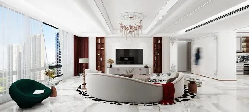 客廳整體空間為淺色系,線條簡(jiǎn)潔硬朗,奠定了空間低調(diào)的質(zhì)感、優(yōu)雅的基調(diào)。天然的理石以及法式的花邊元素,而更像是一種法式精致生活方式的生動(dòng)呈現(xiàn)。