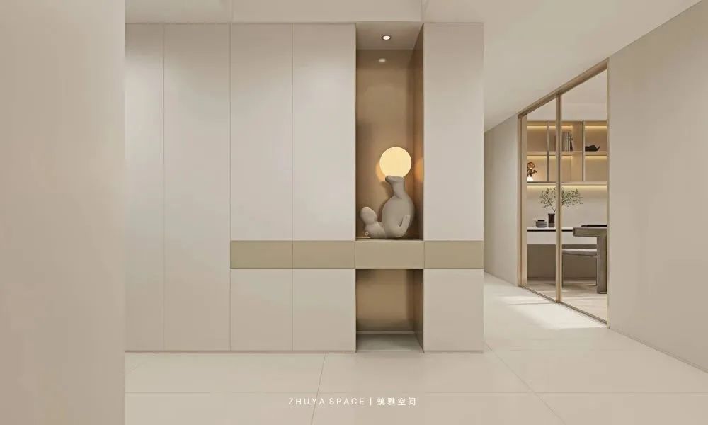 玄關(guān)以暖杏色為基調(diào),嵌入暖光燈帶營造溫馨氛圍,平緩歸家時躁動的心緒。