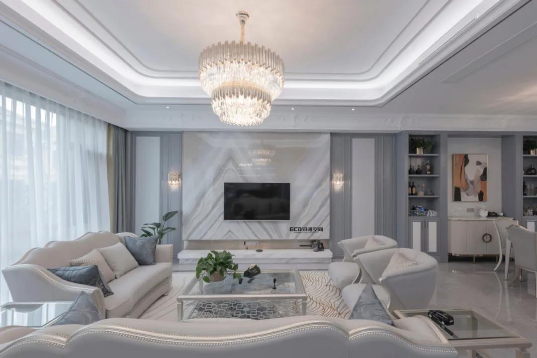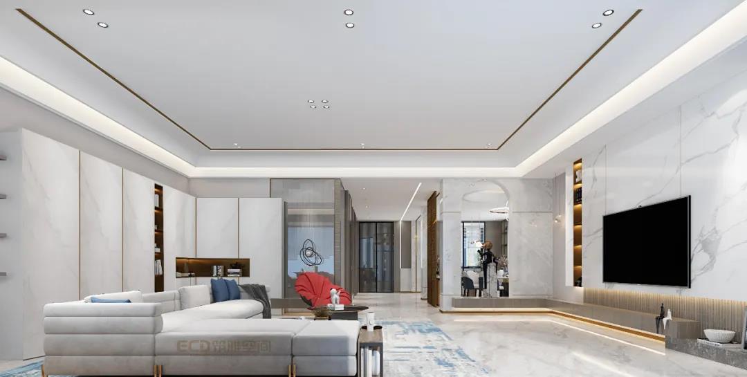 背景墻以燈帶營造氛圍,裝飾畫與線條,喚起全屋格調(diào)。