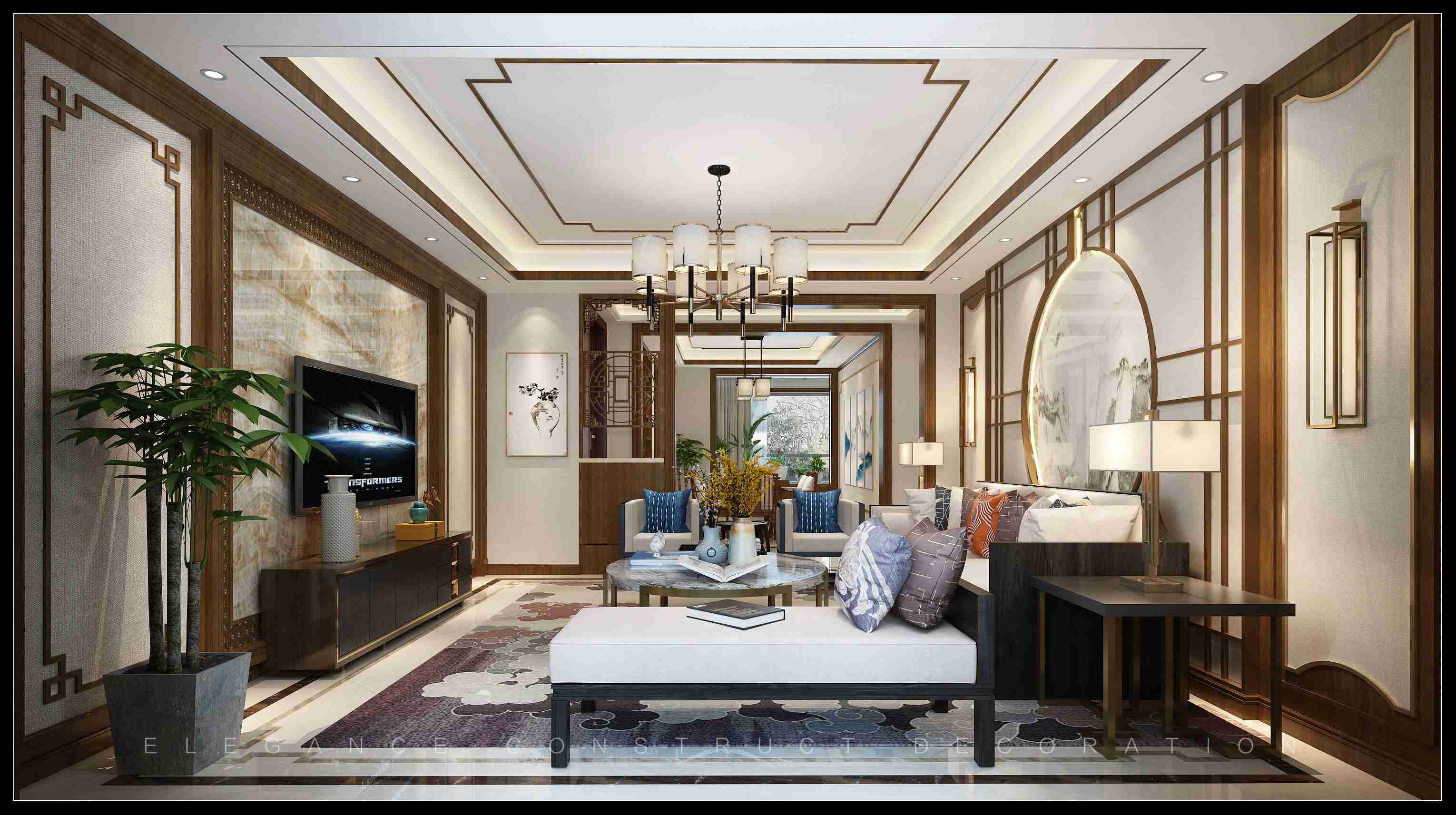 傳統(tǒng)的綠植擺放,與中式精粹青瓷鼓凳,中式元素的空間,使得自入戶起,留給人無限遐想。