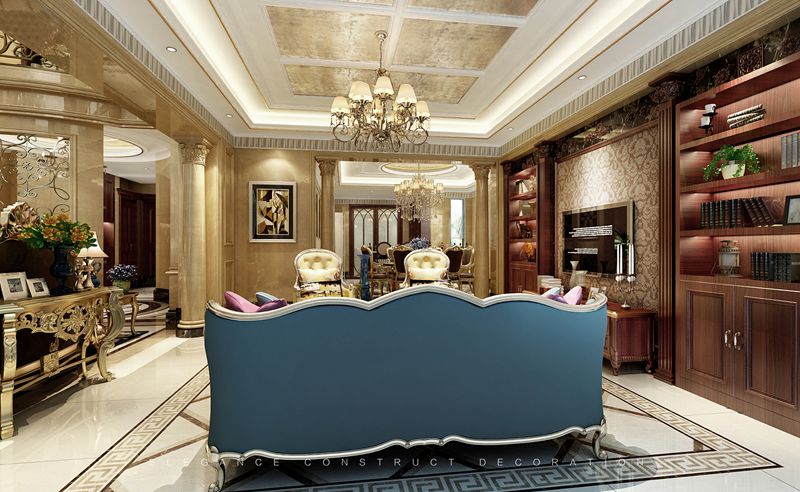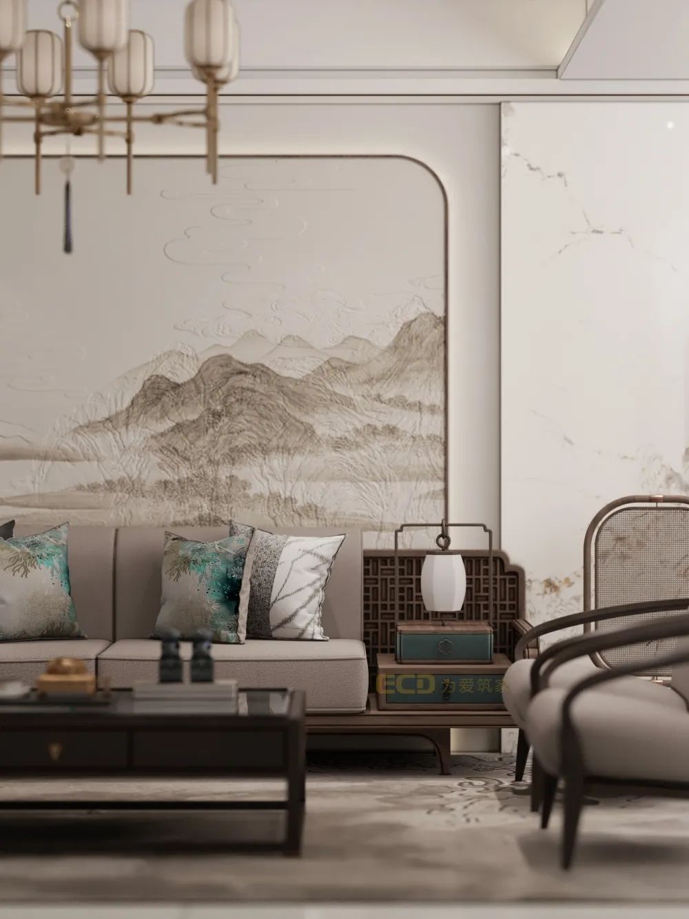 入戶以左側(cè)為客廳,山水鋪滿整面墻壁,木質(zhì)與布藝材質(zhì)在自然光下給人以浪漫致遠,復古的正式吊燈,讓整個空間感十足。