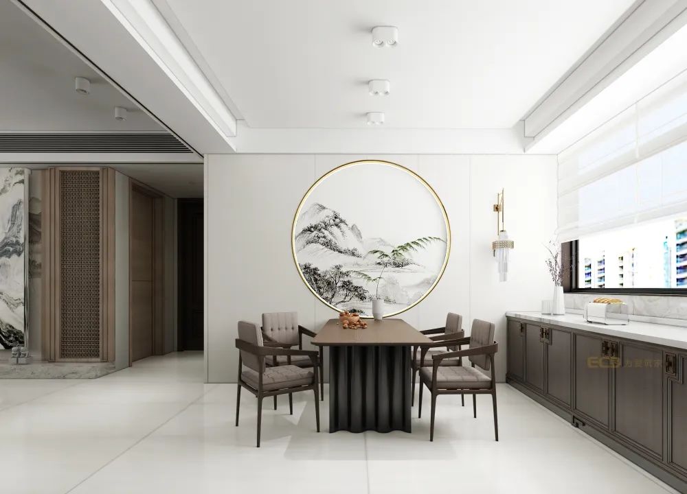 墻上是獨具特色的明清徽派建筑掛畫,中式設計特色與愜意的生活再度于空間相遇。