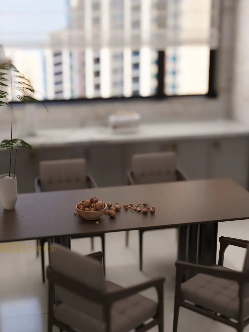 入戶另一側(cè),通向開放式餐廳,木作質(zhì)感的餐桌與餐椅看似冷硬,卻能容納來客熱鬧時分。