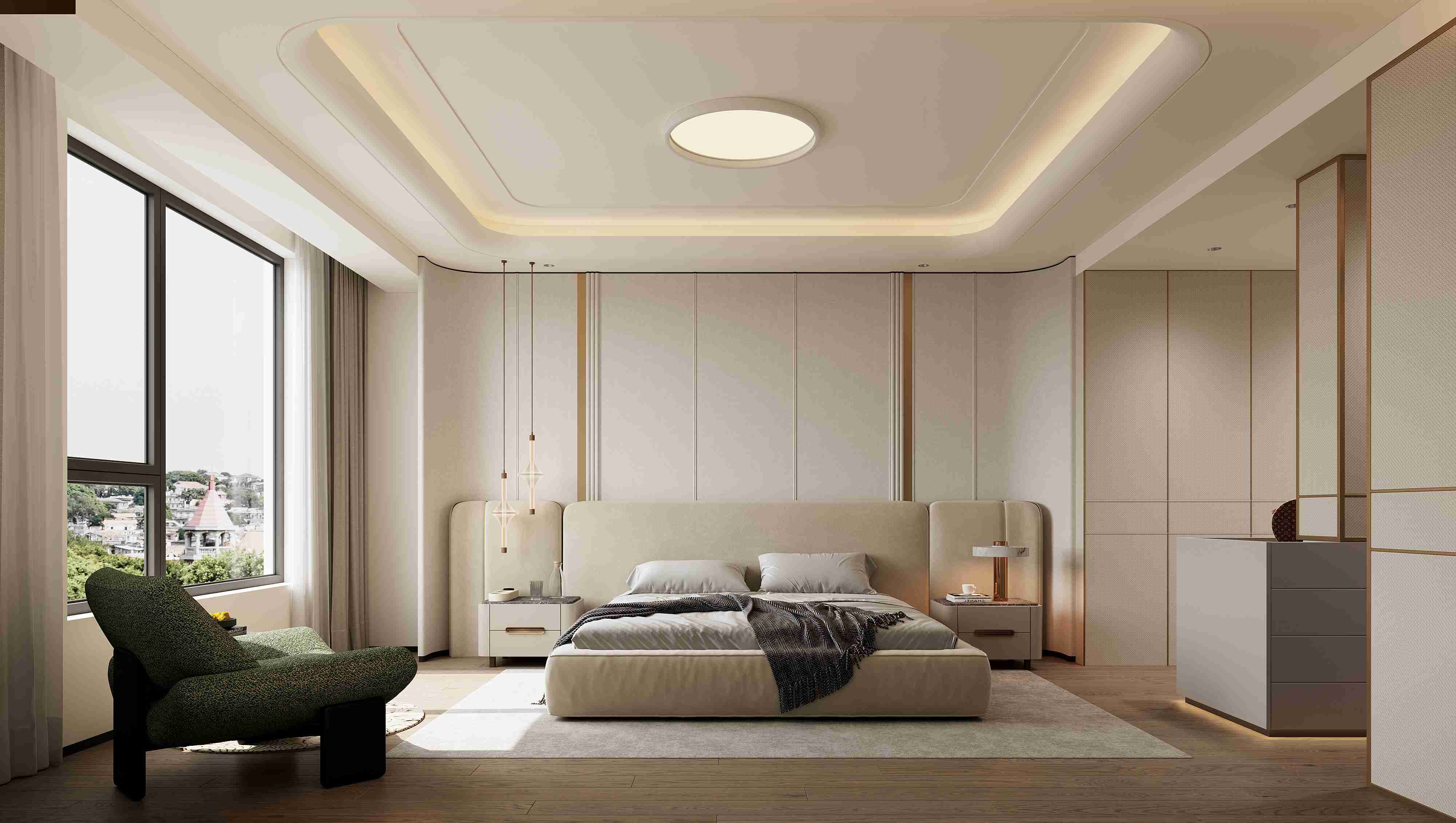 設(shè)計師巧妙整合,使得衣帽間與休息區(qū)形成獨特的視覺效果,開放式的衣帽設(shè)計增加了收納空間和整齊感。